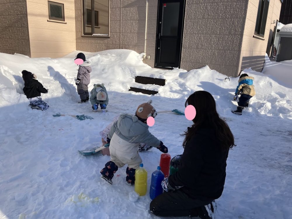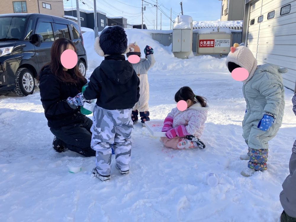 あるふぁの裏庭で色水で雪に色付けして遊びました![]()