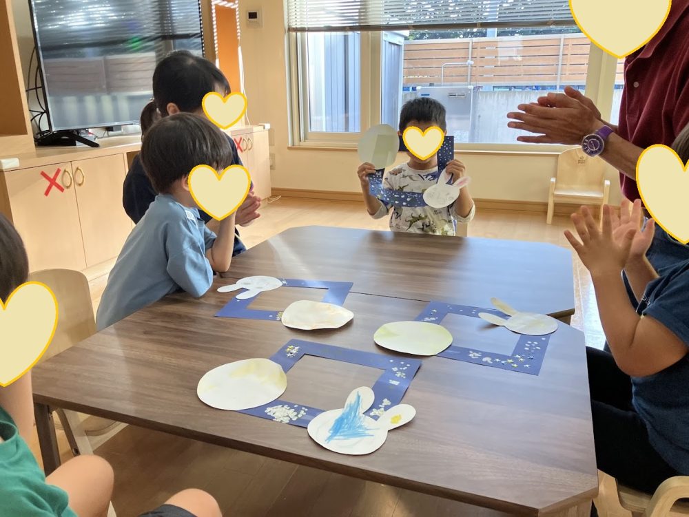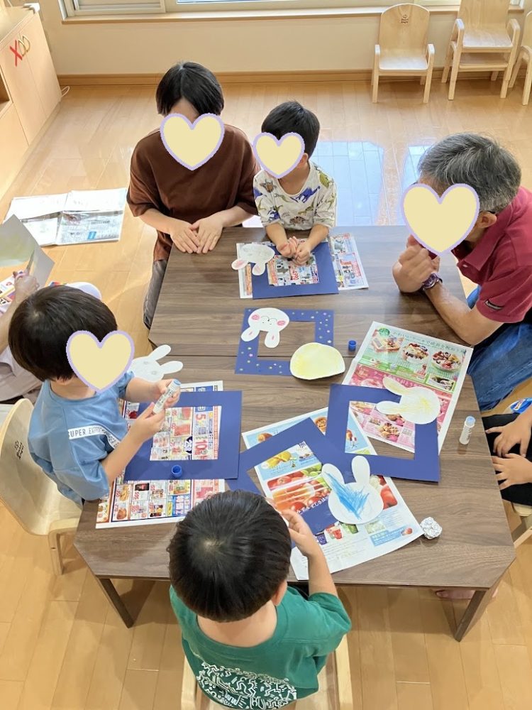 月に模様をつけたり、ウサギの顔を描いたり、絵の具やシールで星空に🤩