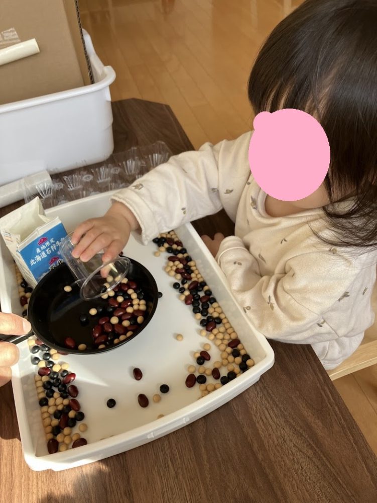【感覚遊び】豆遊び。お豆が転がるだけで、大笑いで楽しんでいました。![]()