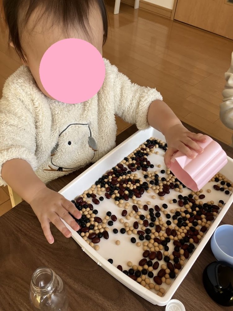 【感覚遊び】豆遊び。お豆が転がるだけで、大笑いで楽しんでいました。![]()